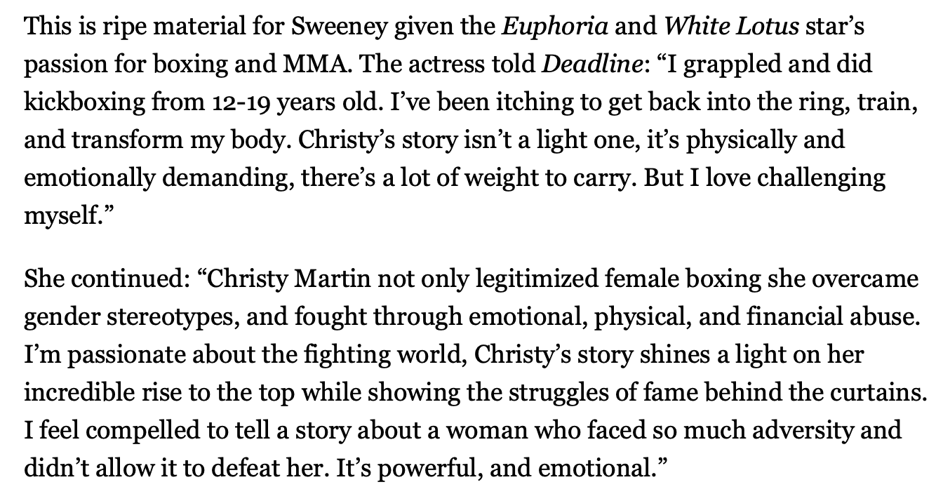 Sweeney is also producer and lead in Christy, a biographical sports film about the boxer Christy Martin. It premieres this week in Toronto.